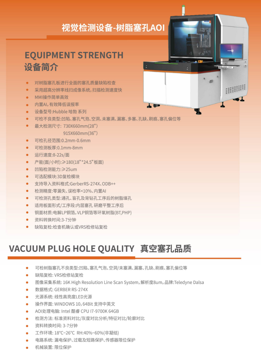 隨著電子行業的高速發展,HDI板5G通訊產品都涉及樹脂塞孔工藝,塞孔工藝(漏塞、氣泡、凹陷等)會造成爆板、虛焊等功能問題。面對現有產品的設計孔徑0.15mm  孔數平均3-5萬孔,即使單點不良都可能造成整張板的報廢,對樹脂塞孔的檢測提出巨大挑戰。我司作為行業樹脂塞孔代工前列供應商擁有大量高中端產品的數據支持,加上我司視覺系統獨特的算法,大大提升了我司設備檢驗的精準度。